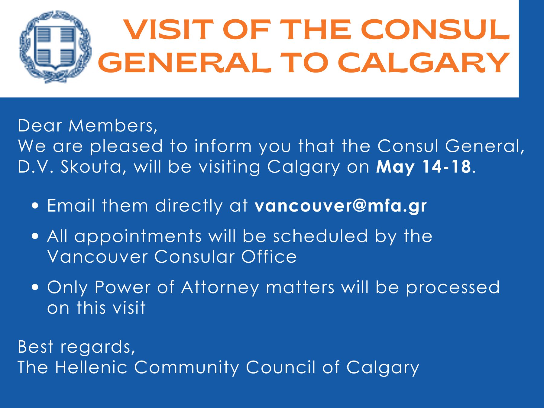 Guest SpeakerGuest SpeakerTime: 4:00 pm Grief and Bereavement - Christina FrangouPlease join us April 25, 2026 at 4 pm at the Hellenic Community Hall to welcome Christina Frangou to our community. | |||