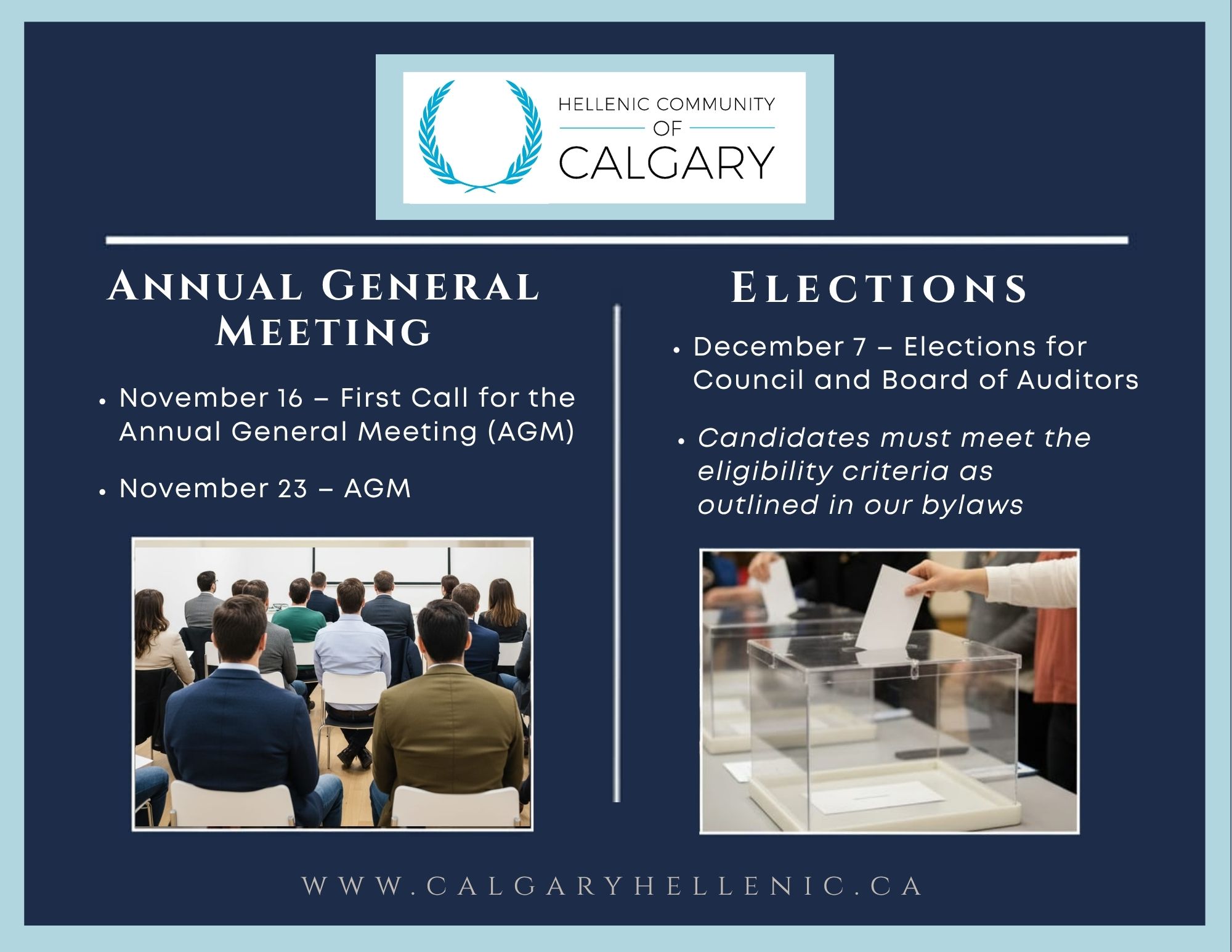 NOV 06| 2:00-7:00PMNOV 07| 12:00-7:00PM NOV 08| 11AM-7:00PM NOV 09| 11AM-2:00PM PRE-ORDER GREEK FOOD & DESSERTS https://greek-ladies-philoptochos-calgary.square.site/ Proceeds to benefit the Hellenic Community of Calgary & Local Charities | 10 | 11 | 12Greek SchoolGreek SchoolTime: 5:30 pm - 8:00 pm Wed Classes