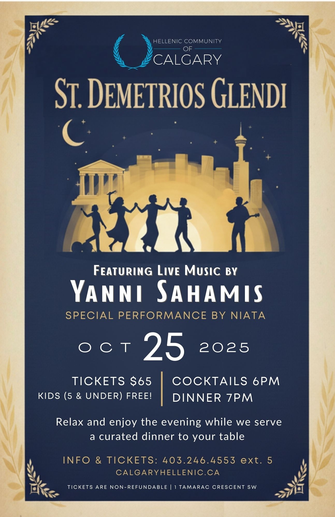 Dionysos looks forward to celebrating our shared Greek culture, music and dances with everyone! Tickets can be purchased by emailing: events@dionysoscalgary.com